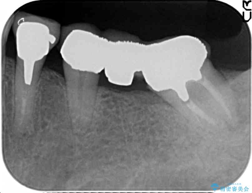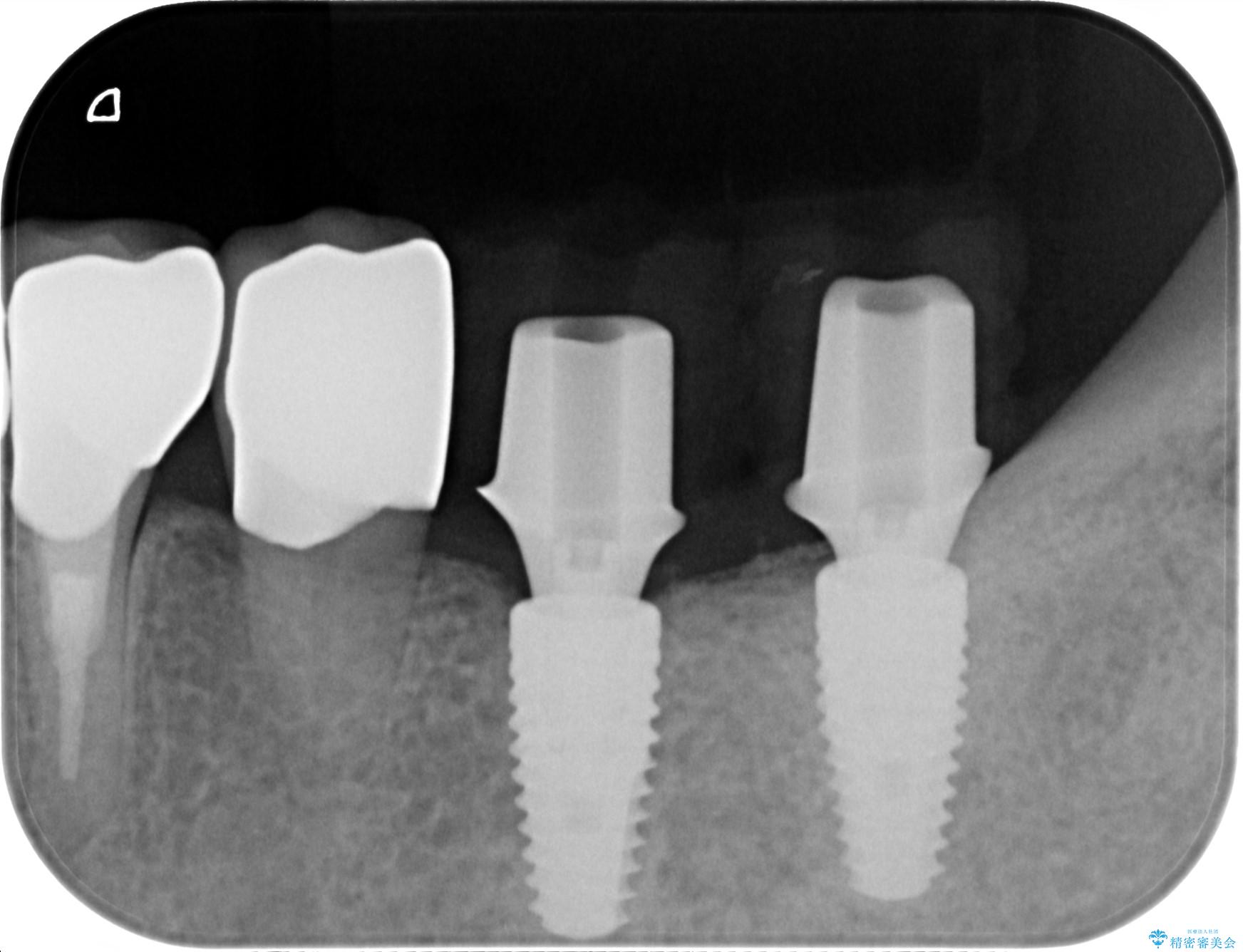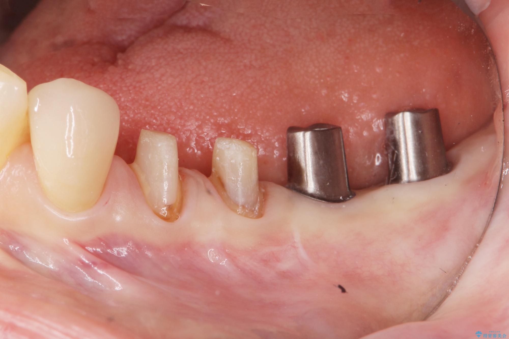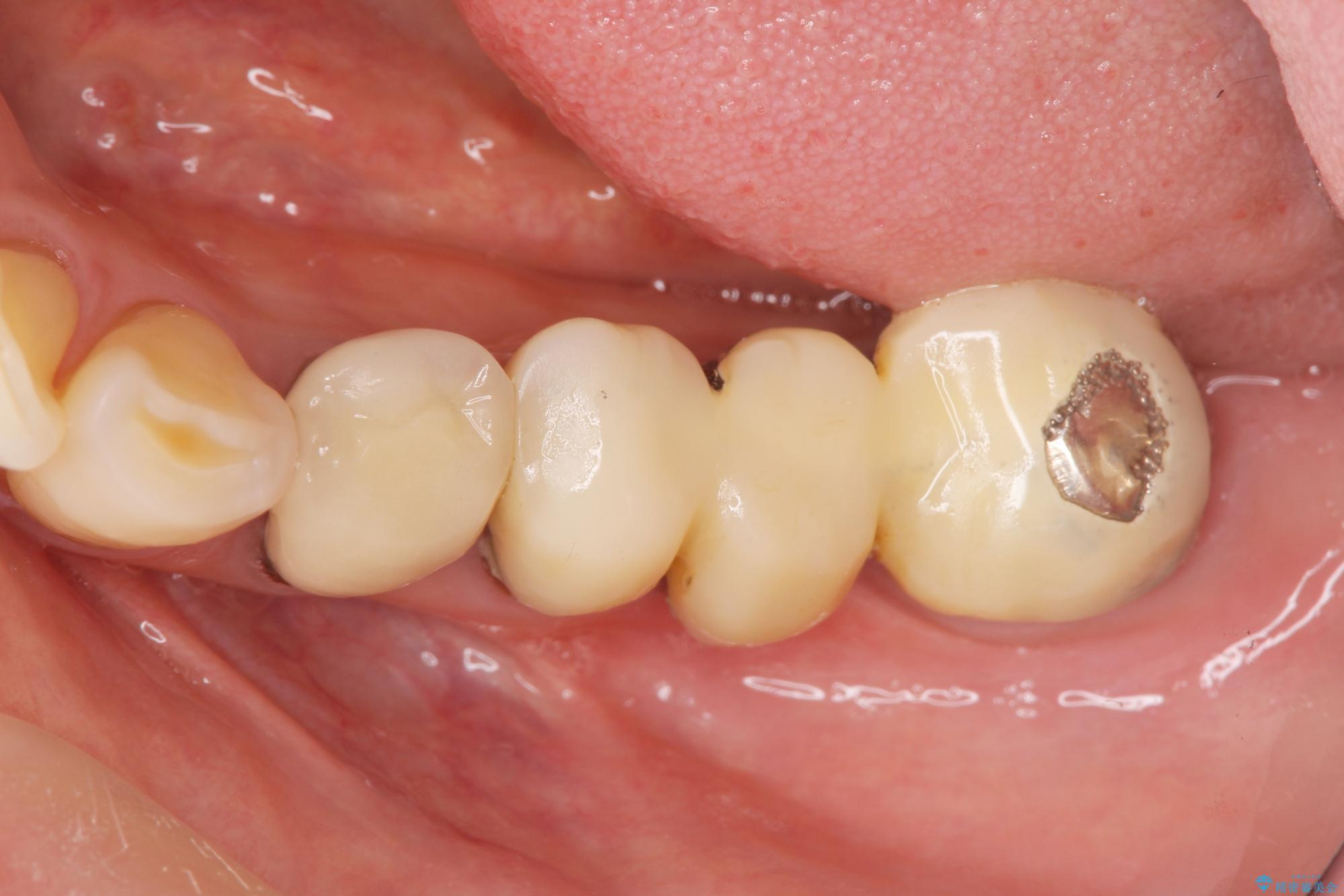 ブリッジの支台となる後方臼歯は清掃性が悪く虫歯が大きくなっていたため、抜去を行いインプラントを用いた治療としました。