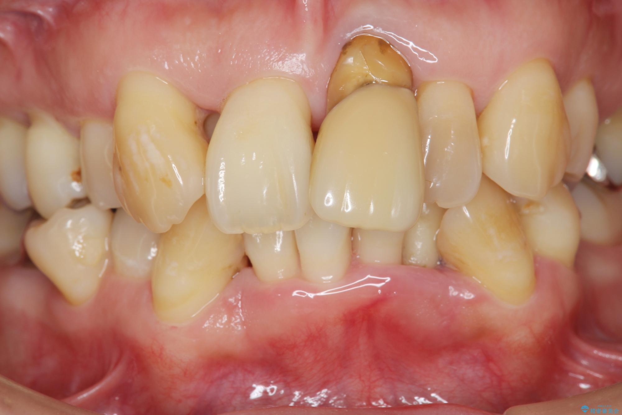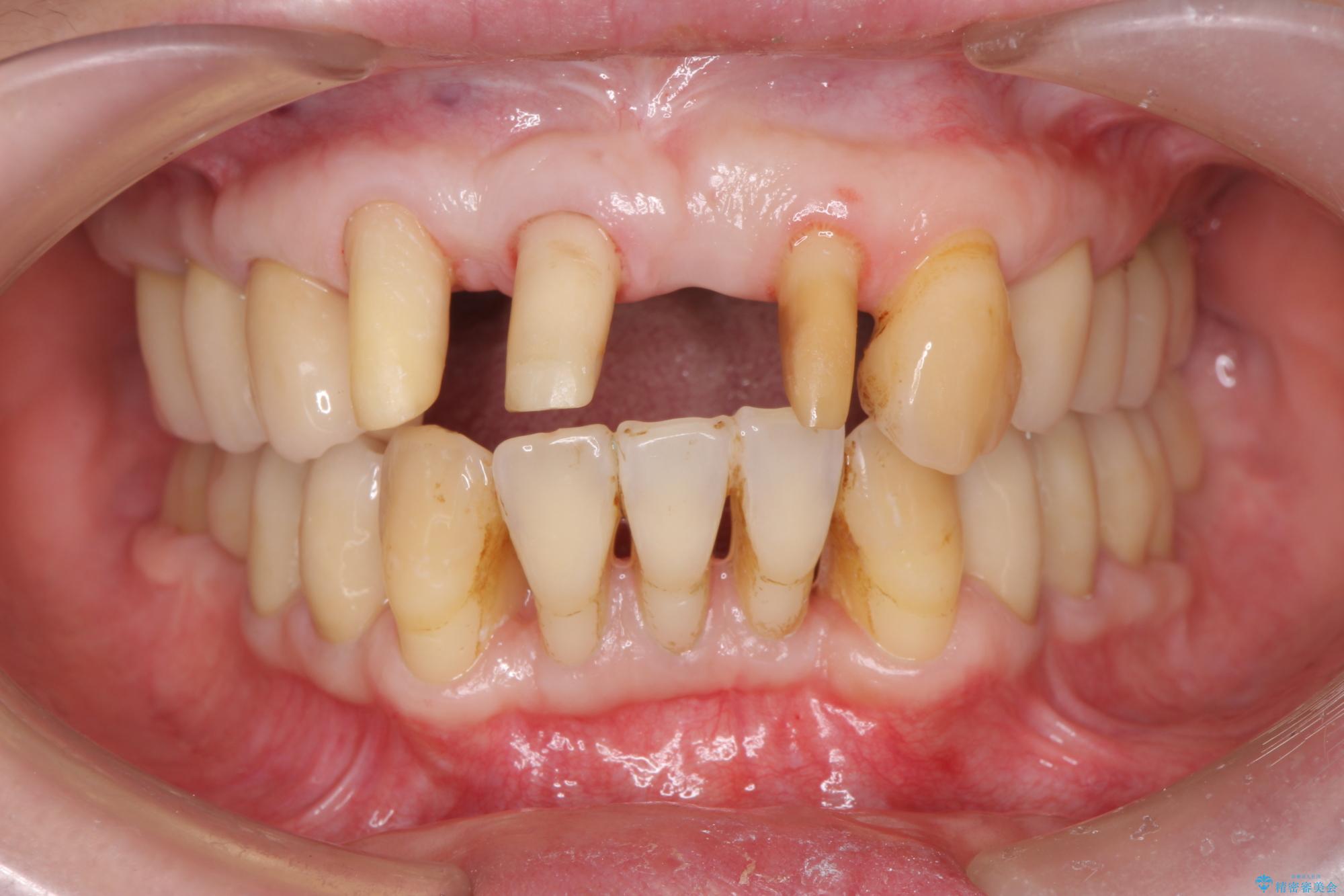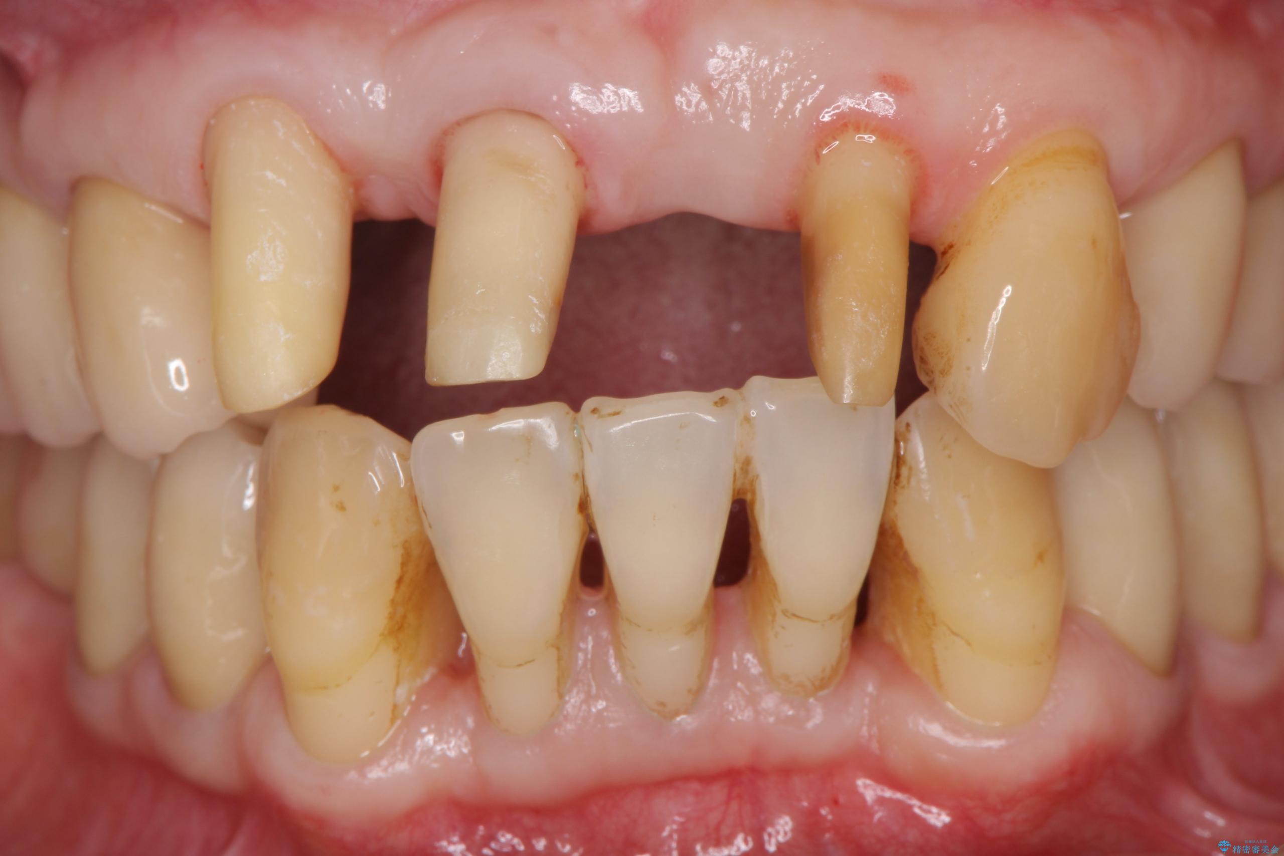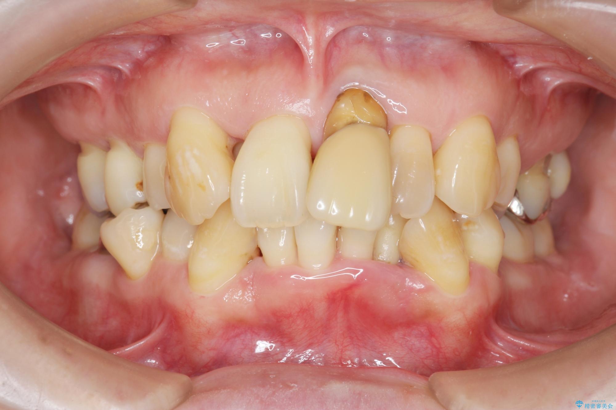 まず、保存の難しい歯を抜去したのち矯正治療を行い歯並びの改善、歯周ポケットを除去したことで安定した歯周環境、咬合関係を作り出すことができました。